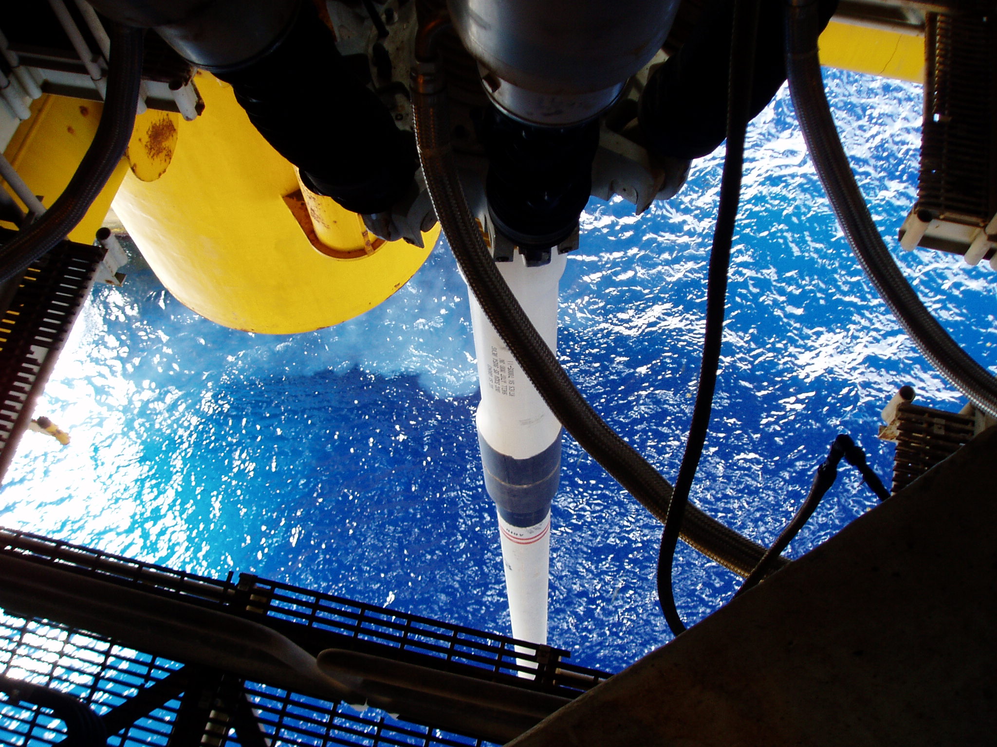 Dit is een boorpijp die in de 1000 meter diepe zeebodem geboord is tot 5500 meter diepte beneden zeeniveau. Zo'n put kan 10,000 tot 20,000 vaten olie per dag produceren.