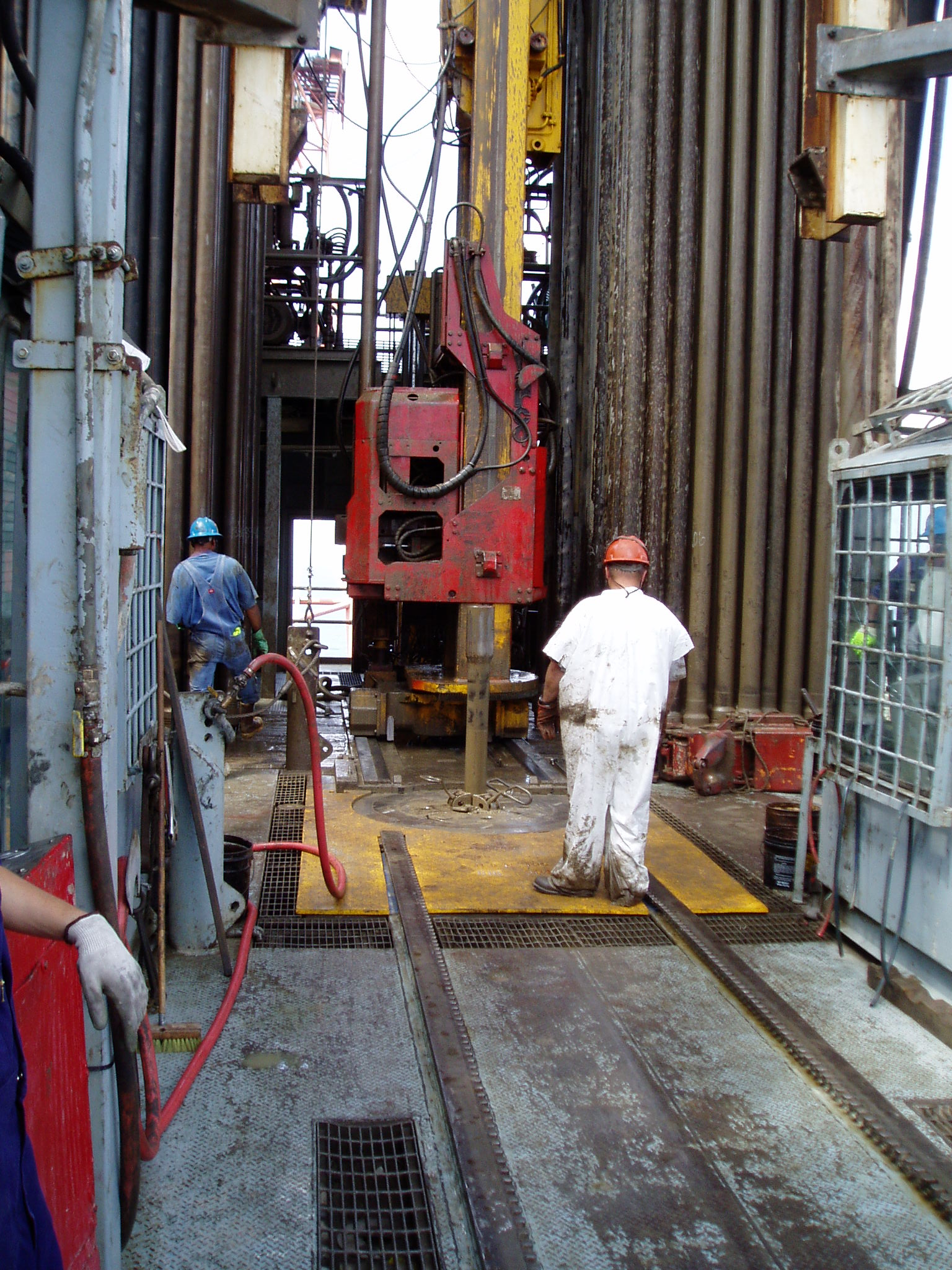 Op de boorvloer voor het vuile werk gedaan. Tegenwoordig gebeurd het meeste automatisch door een boorrobot (rode gevaarte). Het boorpersoneel houdt de zaak in de gaten.